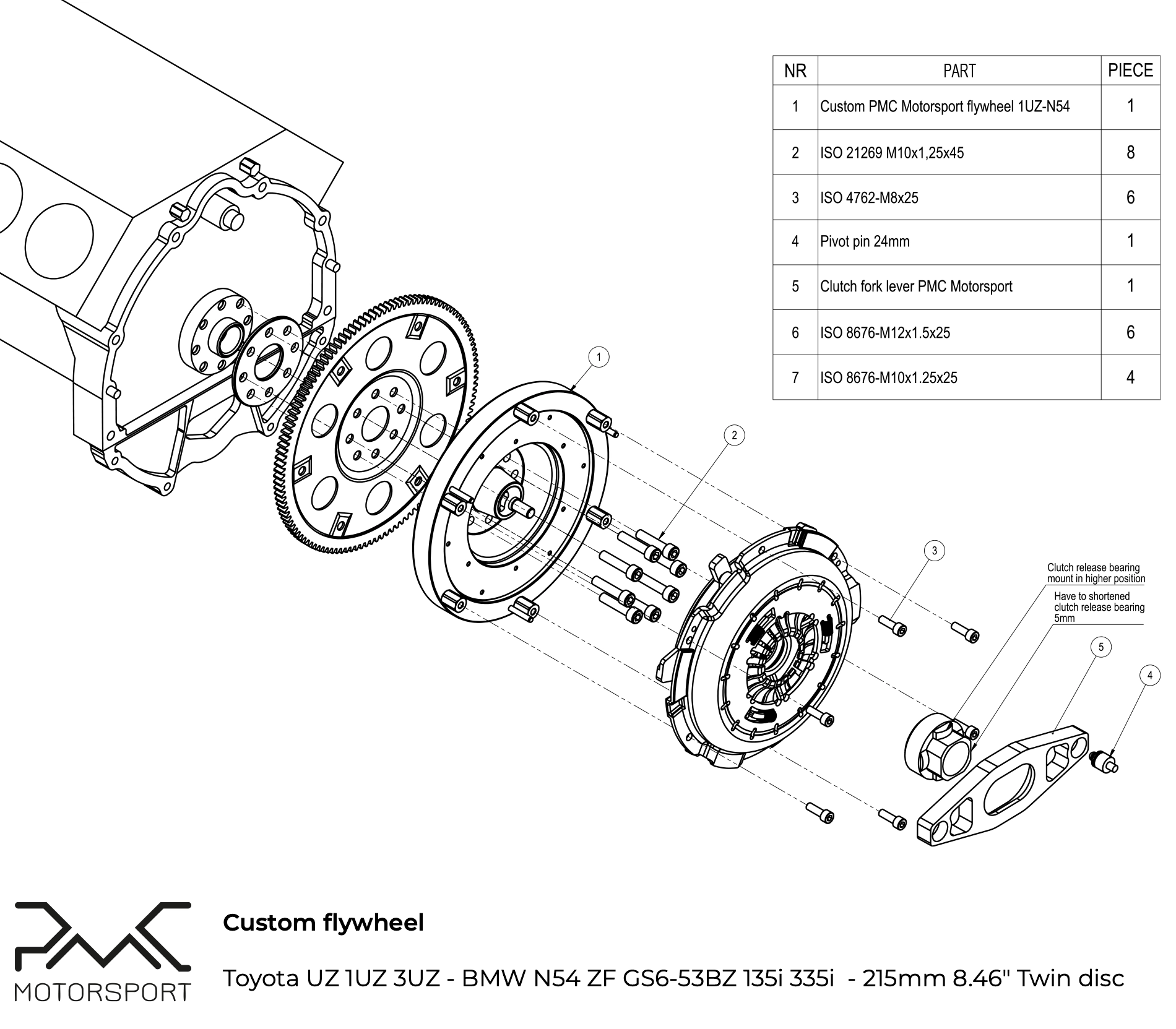 - PMC Motorsport customowe koło zamachowe Toyota Lexus V8 UZ 1UZ 3UZ - BMW N54 ZF GS6-53BZ 6-biegów 135i 335i 535i - 215mm / 8.46" Twin disc
