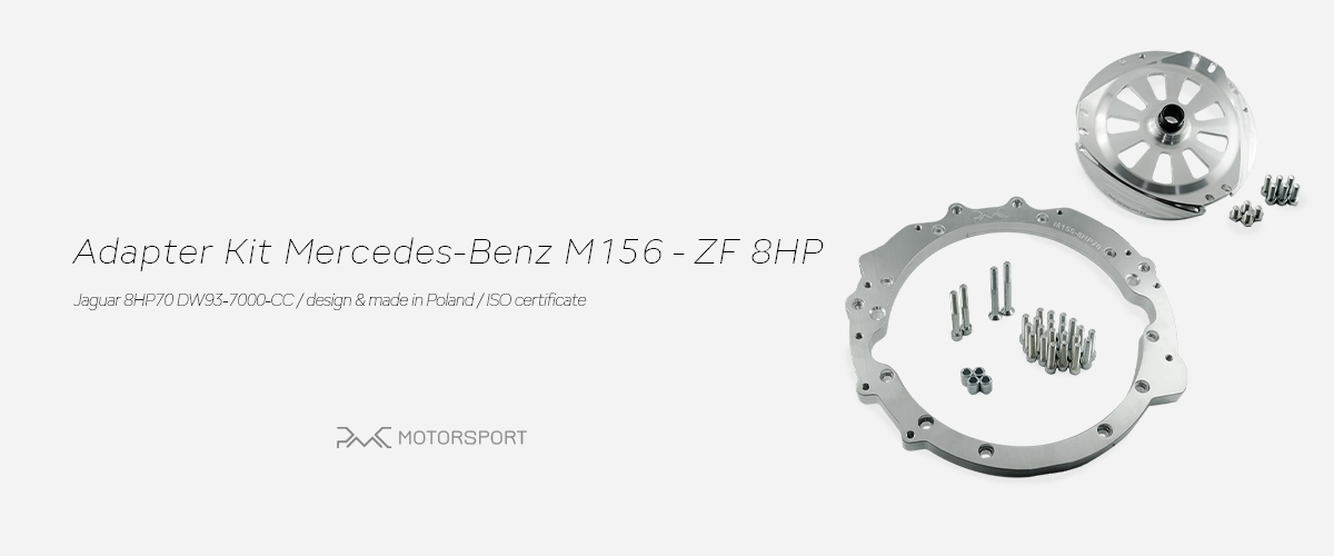 - Adapter umożliwiający połączenie (swap / konwersje) silnika Mercedes-Benz V8 M156 z automatyczną 8-biegową skrzynią biegów ZF 8HP (ZF Friedrichshafen) pochodzącą z Jagura. Zestaw zawiera : aluminiowy adapter skrzyni biegów oraz adapter konwertera
