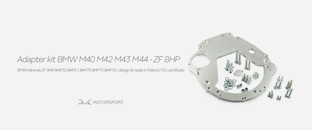 Aby połączyć silnik BMW M40 M42 M43 M44z konwerterem automatycznej skrzyni biegów ZF 8HP pochodzącej z BMW (rzędowej wersji silnika), należy użyć adaptera skrzyni biegów PMC Motorsport i OE wieńca wraz z konwerterem z posiadanej skrzyni biegów 8HP (koło zamachowego z wersji automatycznej). Nie potrzeba dodatkowego adaptera konwertera.