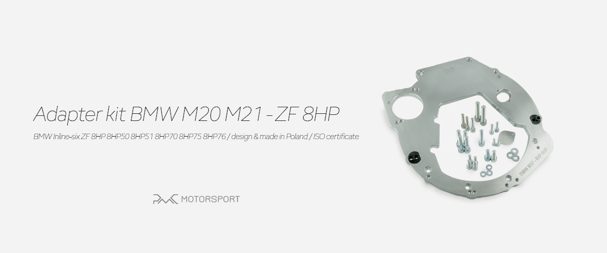 Aby połączyć silnik BMW M20 M21z konwerterem automatycznej skrzyni biegów ZF 8HP pochodzącej z BMW (rzędowej wersji silnika), należy użyć adaptera skrzyni biegów PMC Motorsport i OE wieńca wraz z konwerterem z posiadanej skrzyni biegów 8HP (koło zamachowego z wersji automatycznej). Nie potrzeba dodatkowego adaptera konwertera.